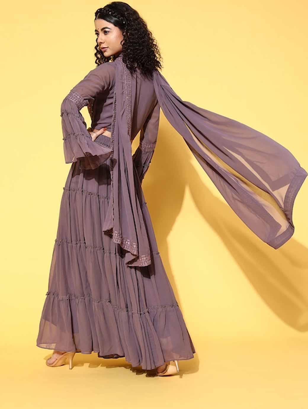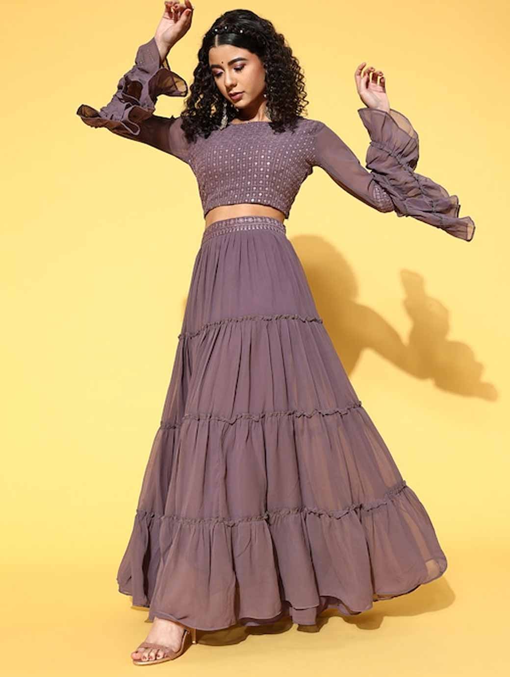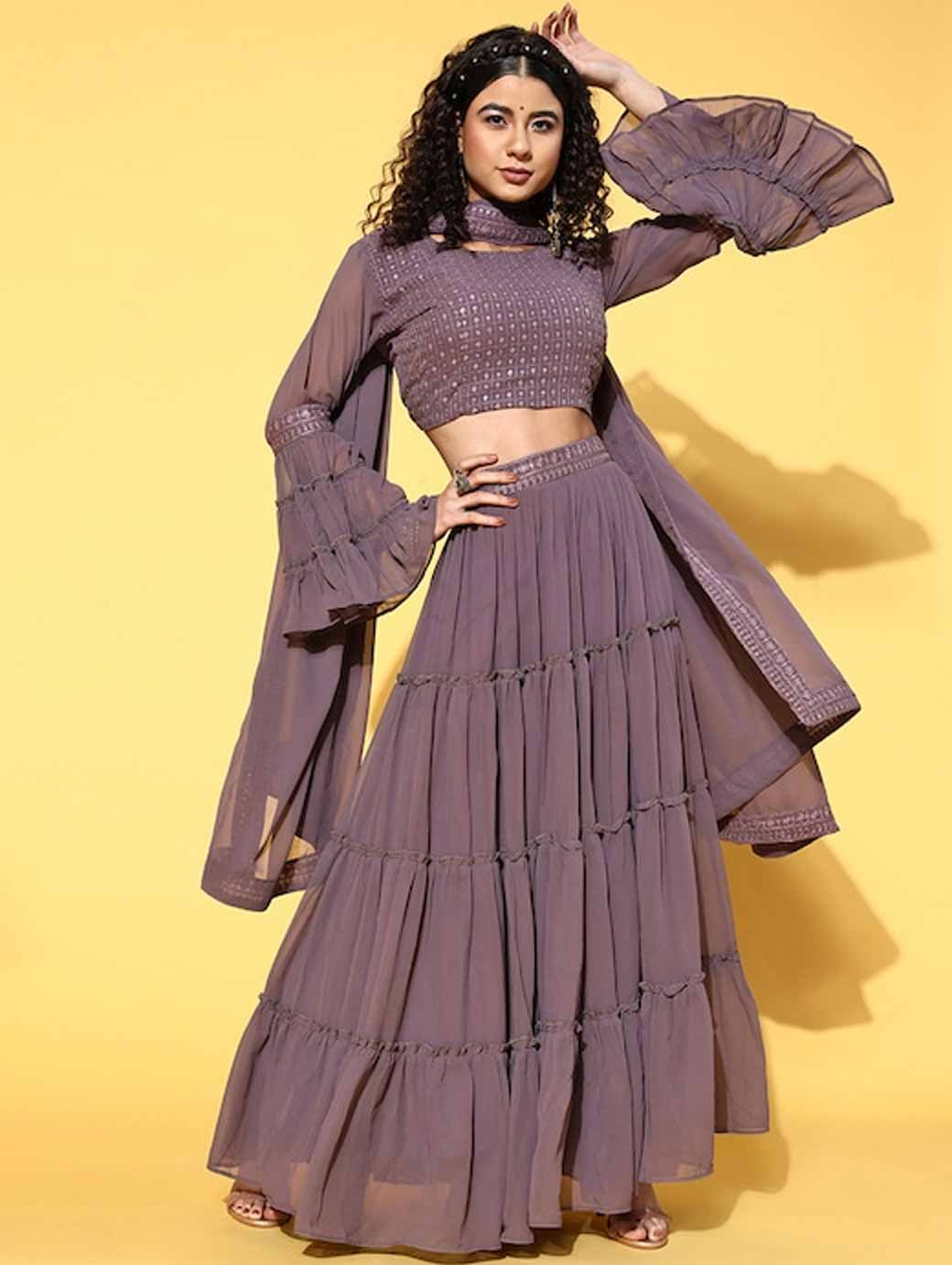 Unstitched blouse, has a round neck, sleeveless, purple and white printed semi-stitched lehenga, flared hem
