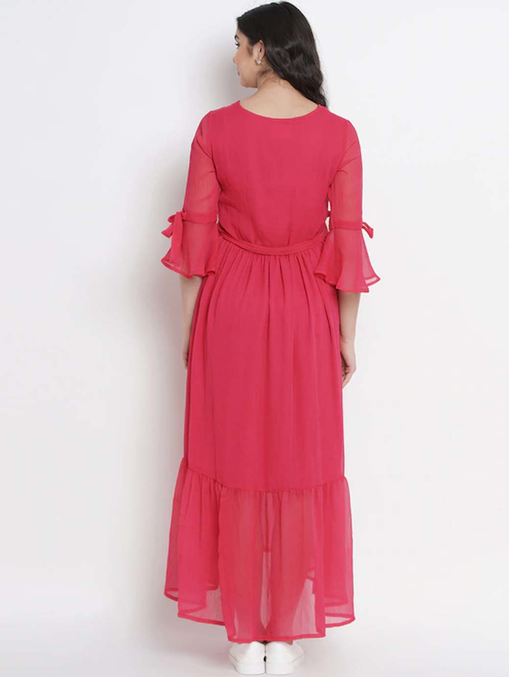 Fuchsia pink solid woven maternity fit and flare dress, has a round neck, three-quarter sleeves, an attached lining, and flounce hem