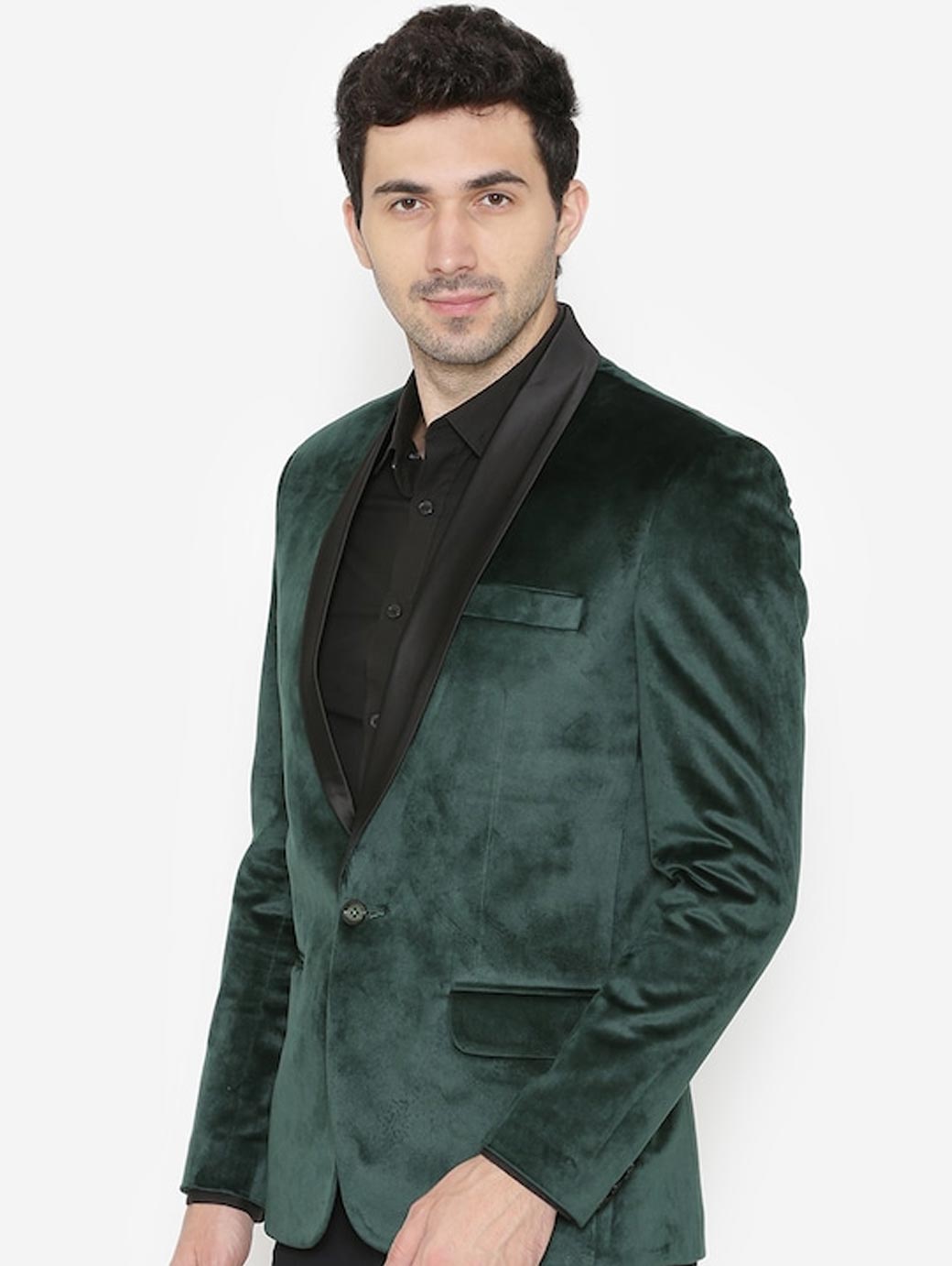 Green solid velvet tuxedo blazer, has a shawl collar, single-breasted with a single button closure, long sleeves, two flap pockets, one chest welt pocket