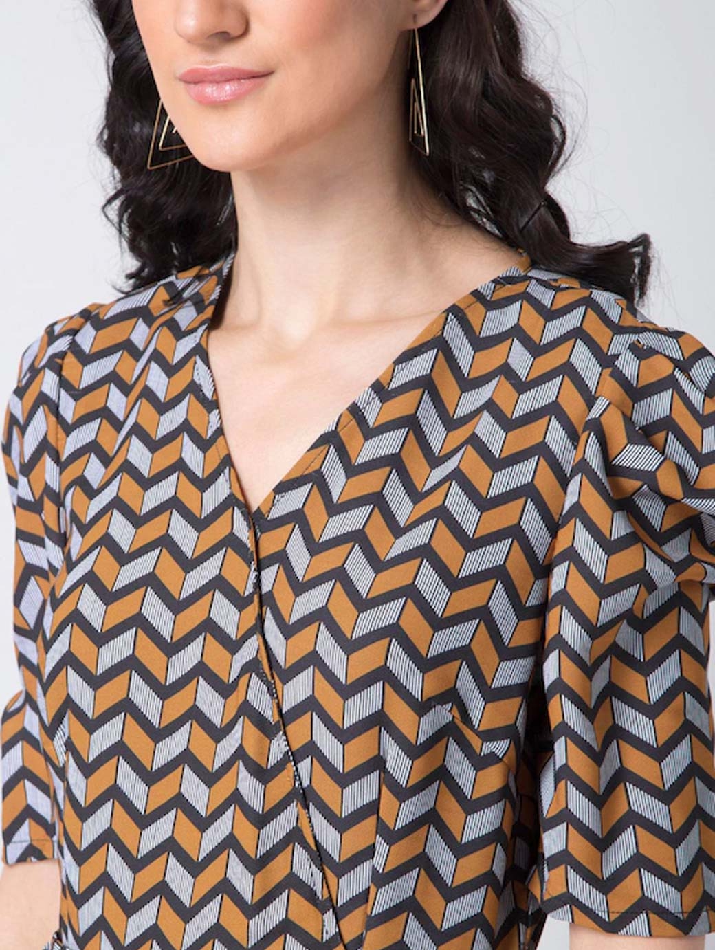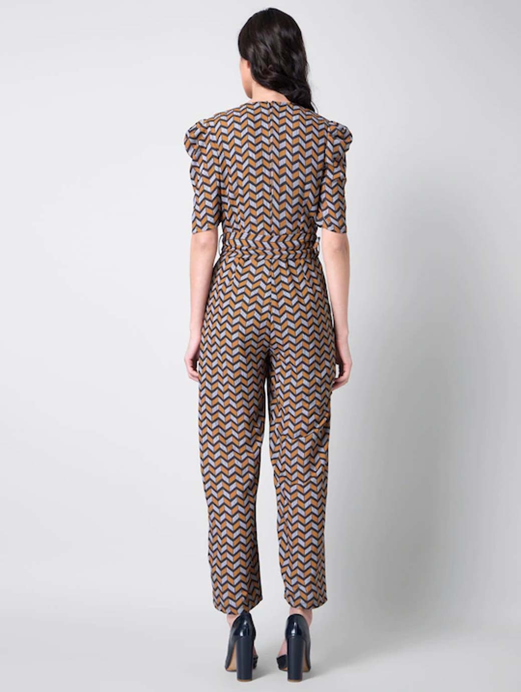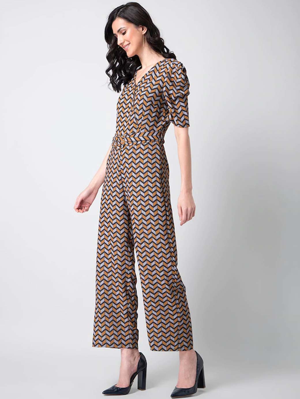 Mustard and grey printed basic jumpsuit with Waist Tie-Ups, has a V-neck, short sleeves, two pockets